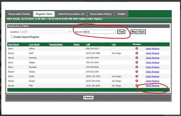 STEP 6: SEARCH FOR THE CLIENTS WE WOULD LIKE TO ASSIGN TO THESE SESSIONS WE JUST CREATED AND CLICK “Find”, THEN CLICK “Select Package” NEXT TO THE CLIENT’S NAME.